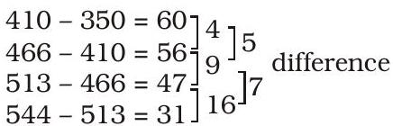 $350 \quad 410 \quad 466 \quad 513 \quad 544 \quad ? $