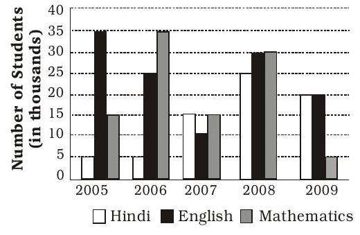 What is the respective ratio between the number of students who opted for English in the years 2006 and 2008 together and the number of students who opted for Hindi in the years 2005 and 2009 together?