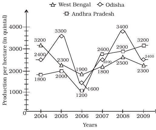 Directions : In the following graph, production of rice per hectare (in quintal) during last six years in three states of West Bengal, Odisha and Andhra Pardesh has been shown, Study the graph carefully and answer the questions given below it.