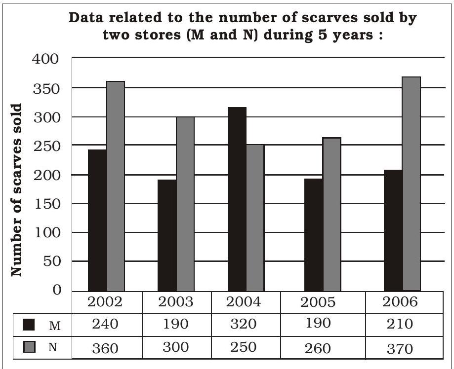 What is the difference between the total number of scarves sold by store M in 2003 and 2004 together and total number of scarves sold by store $N$ in 2005 and 2006 together?