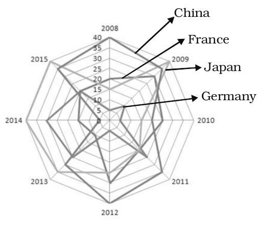 Directions : The following radar diagram shows the number of new companies registered in four countries in various years. Study the following graph carefully and answer the questions given below.