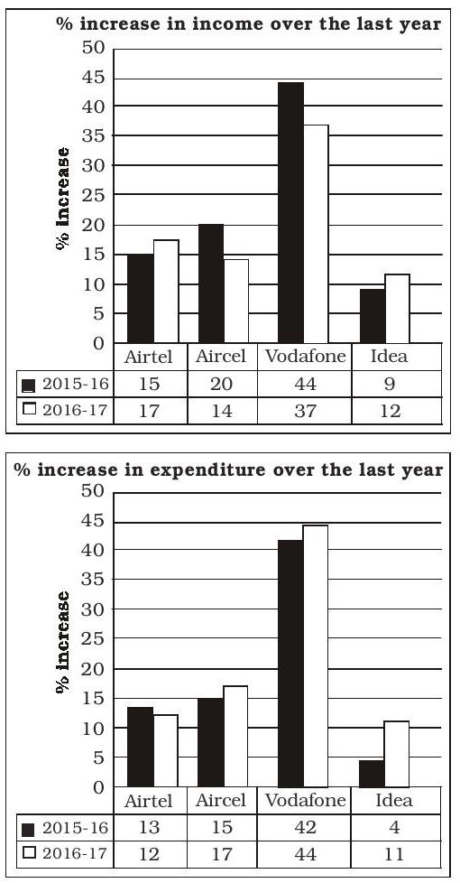 The bar graphs show the percentage increase in income and expenditure of various telecom companies during a period
